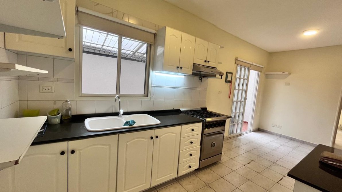 La cocina-comedor es amplia, cómoda, y se conecta con un patio con techo corredizo de policarbonato transparente, ideal para disfrutarlo todo el año