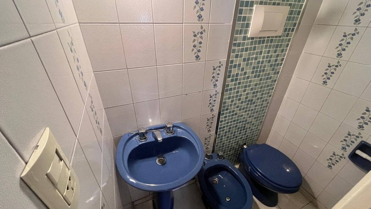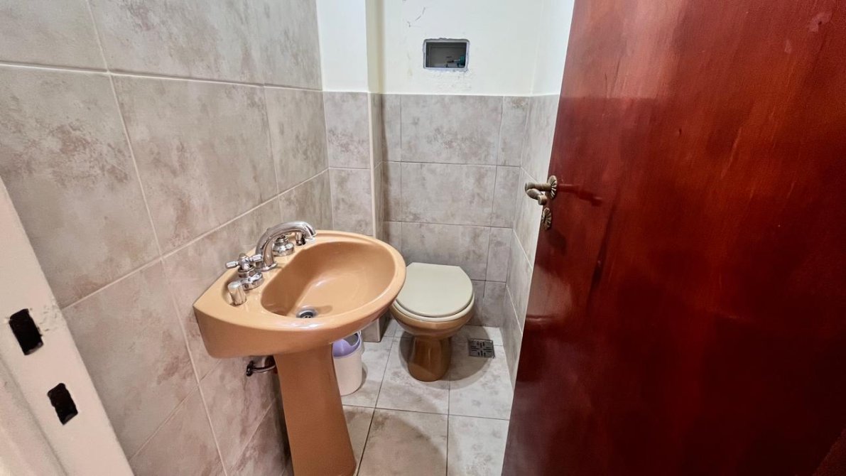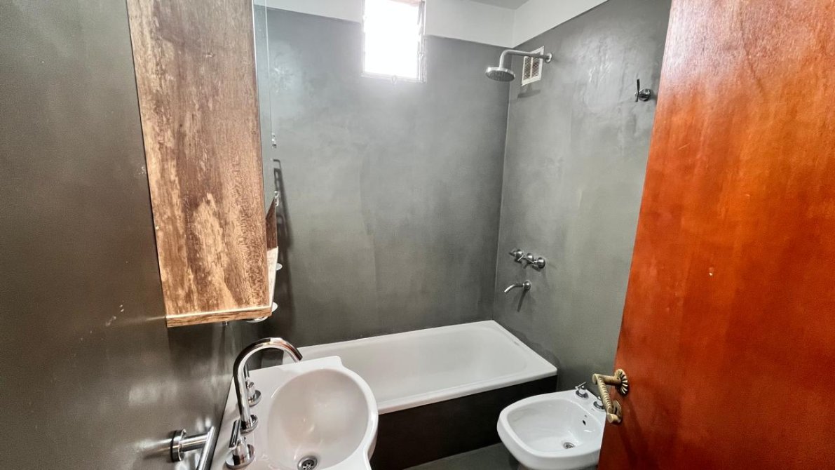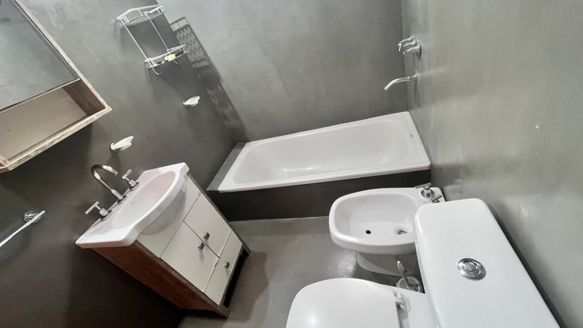 El baño principal está totalmente renovado, con cemento alisado y ventilación natural, y además cuenta con un toilette para invitados.
