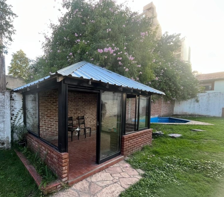 Jardin al fte, living con guardaropa empotrado- hogar con leños-living comedor con puerta balcon al fondo-cocina comedor con mesada pileta- ventilador- lavadero- cocina - despensa pasillo que se comunica con el gge - caldera (no funciona)- dos patios- fondo libre parquizado y arbolado con resto de pileta de 1.50 metros de profundidad de forma irregular revestida con venecitas - quincho con aberturas corredizas desmontables de aluminio .- parrilla. En planta alta: tres dormitorios con balcon saliente y uno con balcon terraza ambos con placard en cedrolistado de pared a pared.- un baño- un toillette con vanitory .