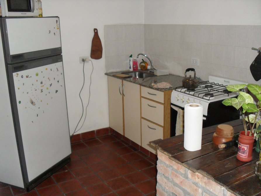 Cocina con bajo mesada, bacha, sector para colocar heladera empotrada y pequeña barra.