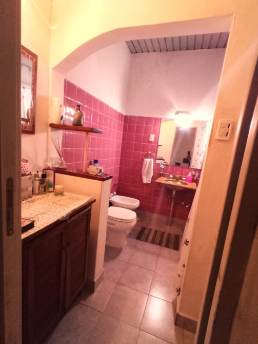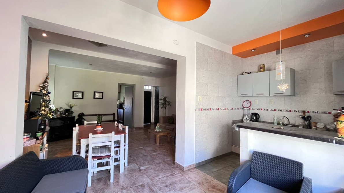 Sobre la línea municipal entrada principal con puerta de reja y acceso con puerta de chapa de seguridad, dormitorio al frente con piso de pinotea, techo de bovedilla y las chapas son trapezoidales colocadas nuevas hace 5 años aprox., el garaje tiene portón corredizo y entra cómodamente un auto sedan 4 puertas. El living comedor tiene bajados los techos en Durlock y la instalación eléctrica nueva, con su caja de luz disyuntor y 4 térmicas sectorizadas y para aire acondicionado,; el pasillo distribuidor nos re direcciona a garaje, segundo dormitorio y baño, este último se modificó y se hizo un ante baño donde se colocó vanitory y espacio de placard, los sanitarios (bidet e inodoro son nuevos) la bañera tiene detalles de enlozado sin rajaduras y conservaron los azulejos de color rosa de la época, el segundo dormitorio tiene acceso por pasillo sus pisos son cerámicos y ventila al espacio libre del fondo) , con un espacio preparado para un futuro vestidor, los techos son de madera vista. El comedor diario con ventana al fondo libre tiene un desayunador con madera lustrada mediante una ventana de aluminio anodizado blanco, nuevo con sus respectivo taparrollo, la cocina tiene mesada granito gris con bacha doble y las cañerías son nuevas de termo fusión, artefacto de cocina y termo tanque, los muebles son de chapa mantuvieron los que estaban y presentan algunos detalles de pintura. Toda la instalación de gas es nueva con SIGAS, cañerías de agua nuevas (termo fusión), el techo nuevo con chapas trapezoidales y cabreada de madera a la vista. Living comedor con pisos porcelanato
