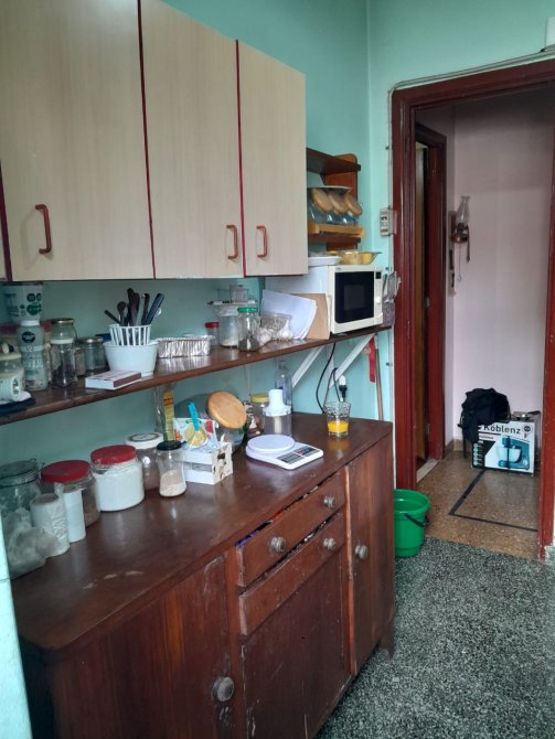 Cocina separada, con muebles bajo mesada y alacenas colgantes, con salida a pasillo de acceso al patio propio.