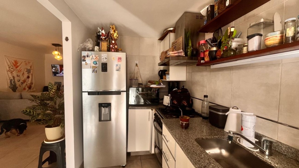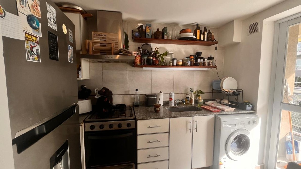 La cocina es completa, con muebles bajo y sobre mesada, funcional y bien resuelta, también orientada al frente.